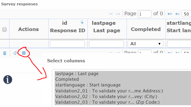 | Description | The response overview at Limesurvey v2.6 LTS had a great feature. At the bottom of the table one could click an icon to select the columns which should be show at the tabular overview (see screenshot). Unfortunately, that feature is now missing at Limesurvey 3.x. It would be a great benefit to re-add this. | ||||