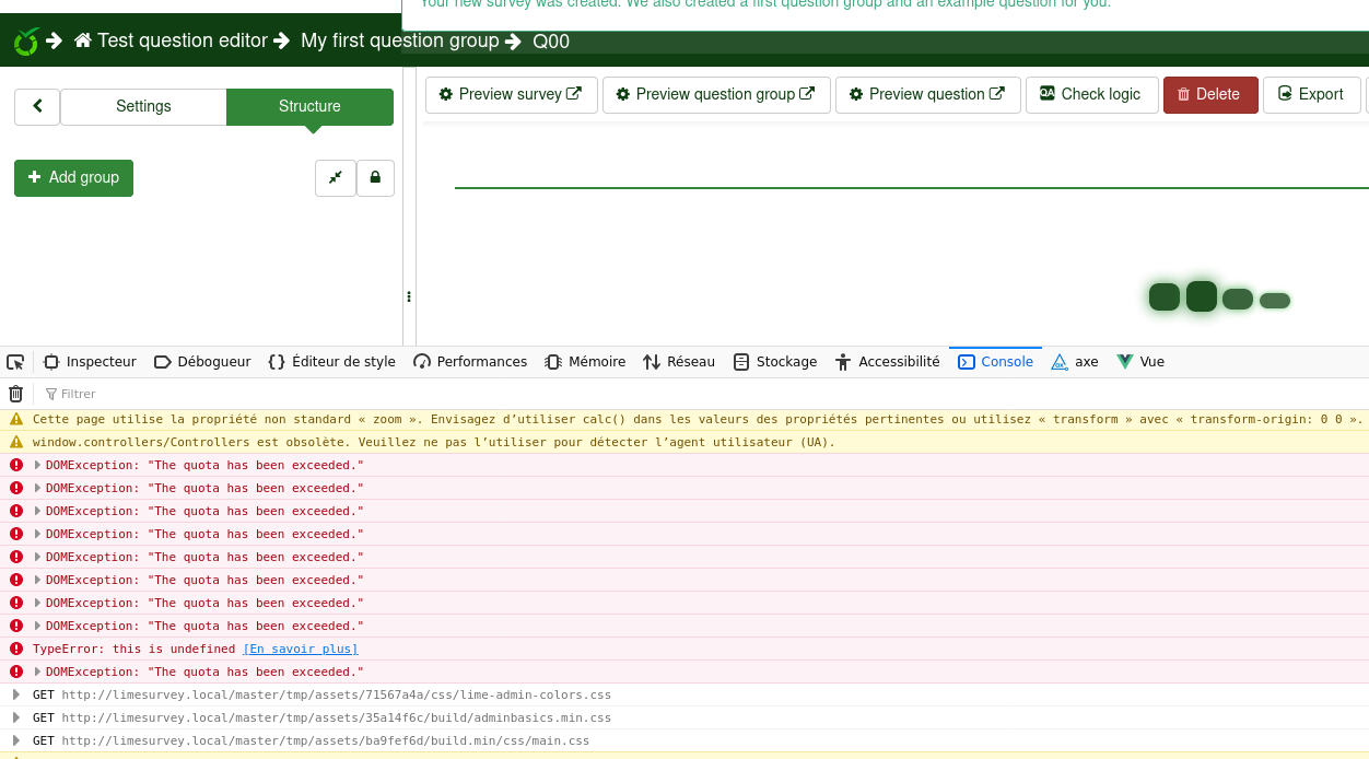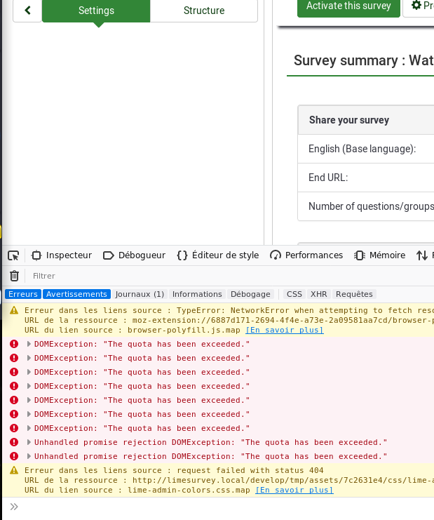 | 2019-07-23 13:11 | DenisChenu | Summary | No surveys menu => No surveys menu : Local Storage QuotaExceededError: The quota has been exceeded. |