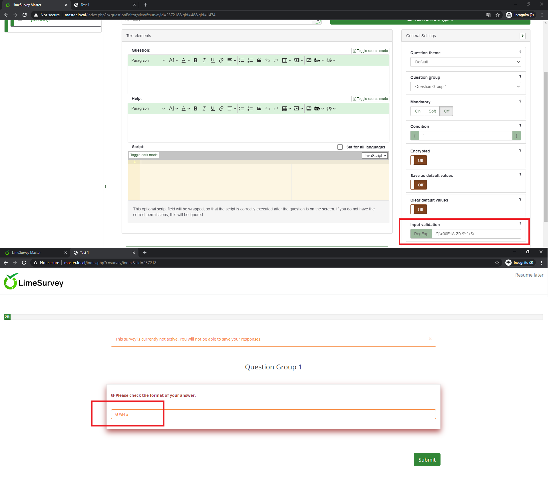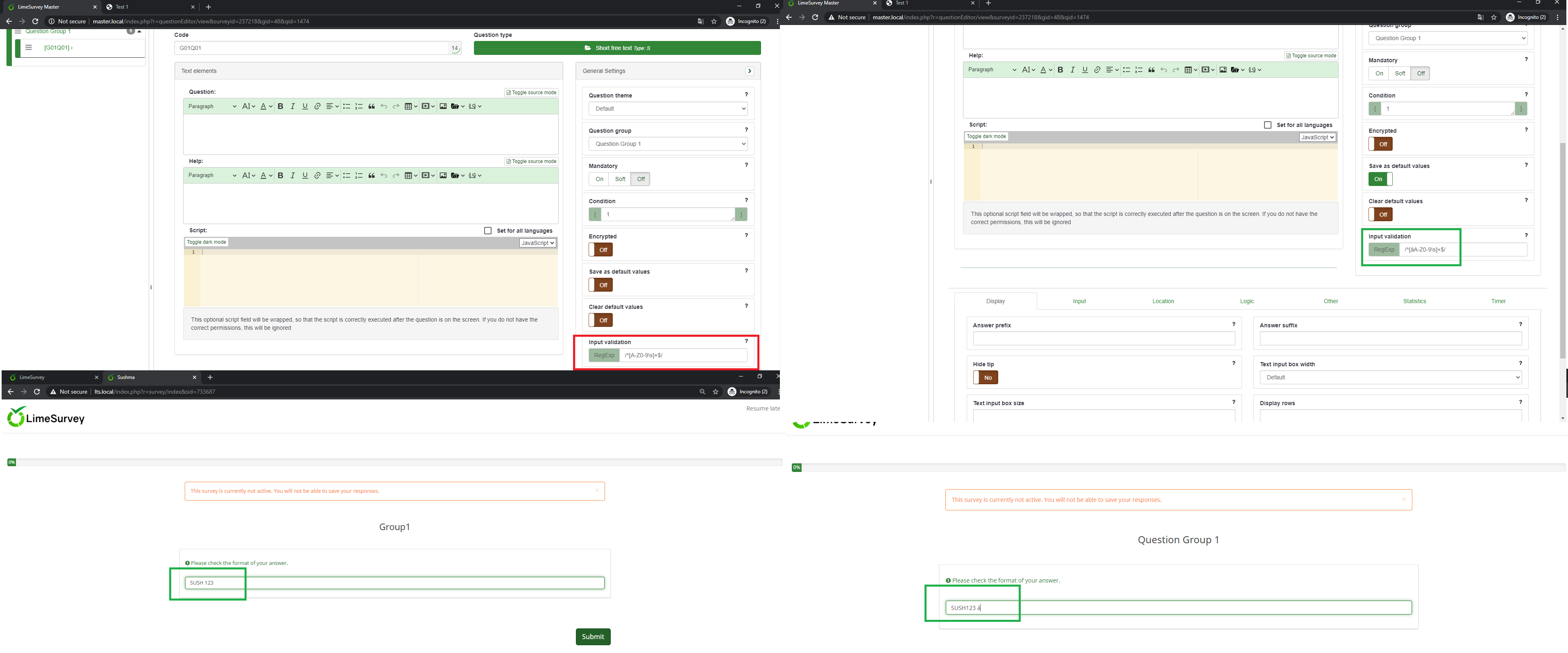 | Steps To Reproduce | Using a test survey, apply this validation regex to any response field and test... | ||||