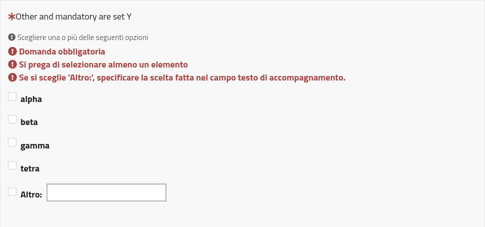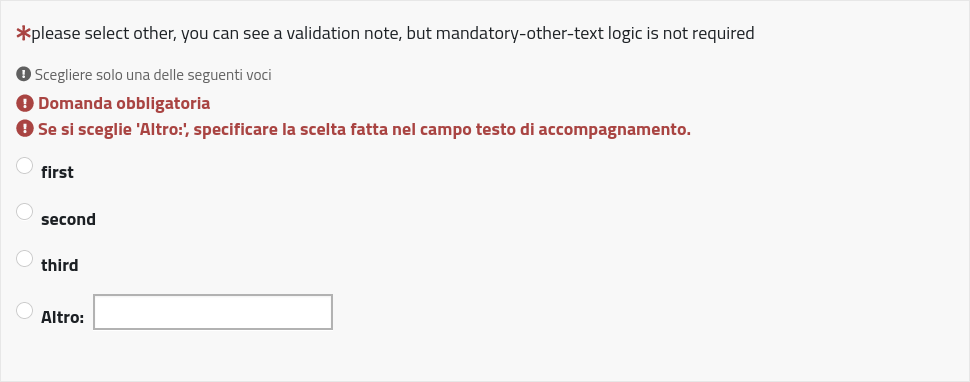 | Additional Information | The "sibiling" situation works and validates correctly, when you choose checkbox multiple answer list with mandatory and others options enabled, the validation blocks the partecipant if they don't type anything inside the "other" option. | ||||