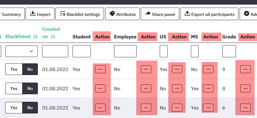 | Description | I am not able to edit any participant entries in the CPDB. The Action menu appears next to each property instead of just once for each participant. (see screenshot) None of the entries in any of the Action menu for each participant does anything when clicked. The URLs attached to each option in the Actions menu is the same as the URL for the page that I'm on. Community Edition Version 6.1.4+230620 | ||||