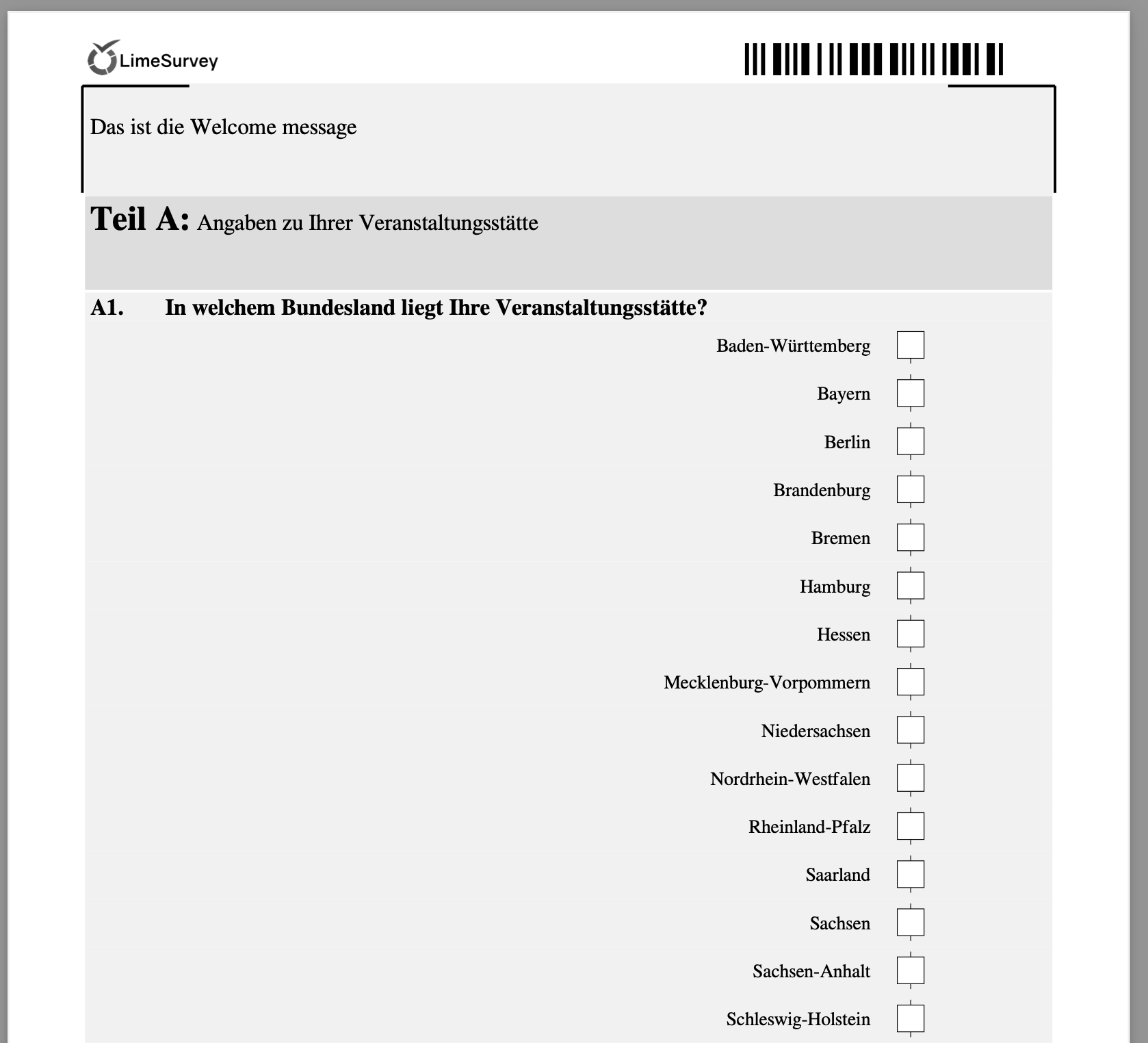 | Description | In QueXML PDF export the survey name is not displayed. It starts with the Welcome text. | ||||