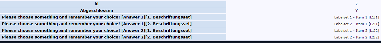 | Additional Information | See in common.php/getextendedanswer() : the "$this_answer=$row['title'];" line gives always the last value, and the # part of $fieldcode is never used. I change this function : see "common-New.php" | ||||