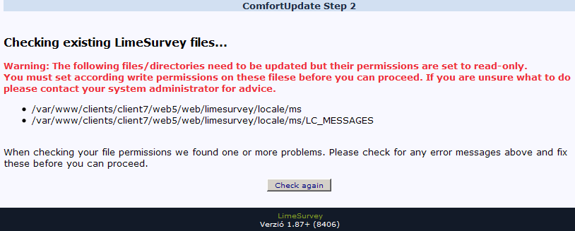 | Description | I've successfully updated LimeSurvey 2 times with ComfortUpdate. However, now the update package contains a new language file (and corresponding folder) and when ComfortUpdate tries to create the necessary folders/files for it (eg. locate/ms folder), it fails and therefore stops at Step2 (see attached screenshot). If i manually create the 'ms' folder before the update process and restart ComfortUpdate, it will have a different warning message (something "how strange that you already have a folder that should not be there ..."). I could create all the necessary files and folders instead of ComfortUpdate until it succeed, but it is not expected to work that way. | ||||