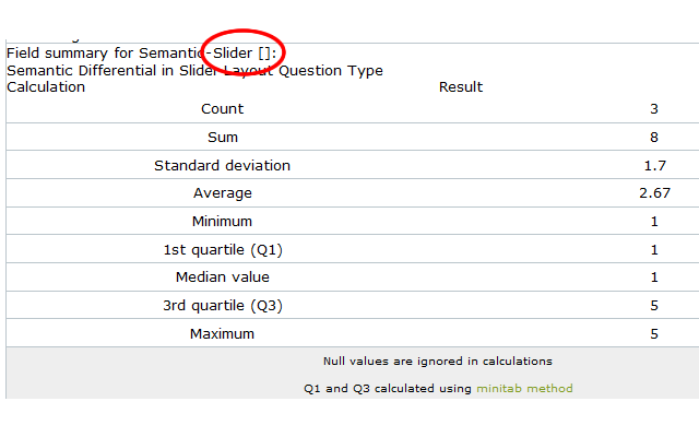 Here's another snag. When using the attached limesurvey_survey_85389.lss with only the first question (semantic slider) set to show in public stats, there is no indication of which sub-question is being summarized, See my screenshot - field_summary_title_1.png. |