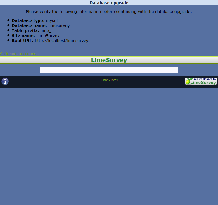 + echo "<a href='{$rooturl}/admin/admin.php?continue=1'>" . $clang->gT('Click here to continue') . "</a>";
