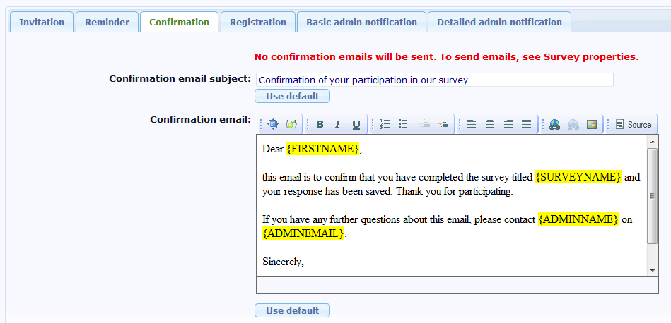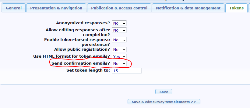 | Description | The current method of preventing confirmation emails from being sent (deleting all content in form fields) is not intuitive. The attached patch adds a setting to the Survey properties --> General settings --> Tokens tab to allow the prevention of confirmation emails (see image_1). If "Send confirmation emails?" is set to "No", no mails will be sent and a warning is displayed in the Survey properties --> Email templates --> Confirmation tab (see image_2). | ||||
