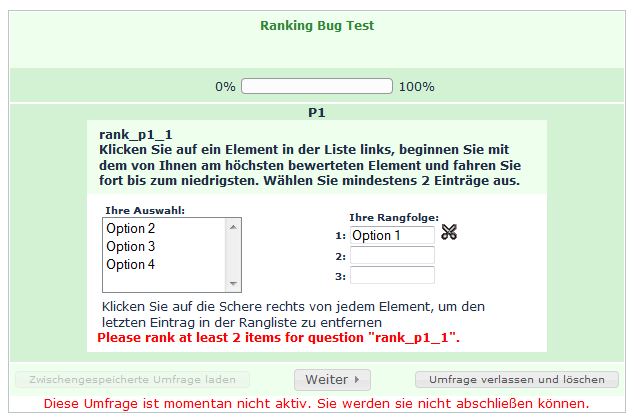 | Steps To Reproduce | Load and run the attached survey. Rank less than 2 items in the first group and try to submit. | ||||