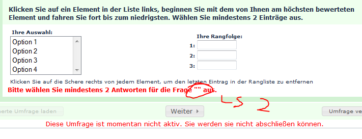 | Description | In a German (and probably other languages) survey, the error for too few ranked items is not translated to German. | ||||