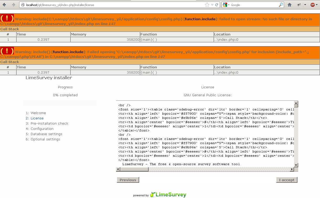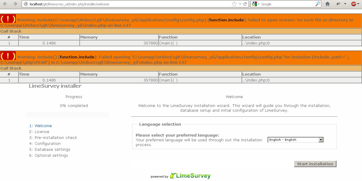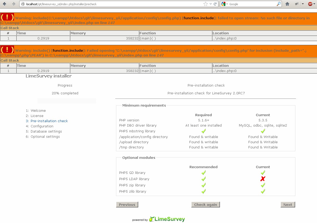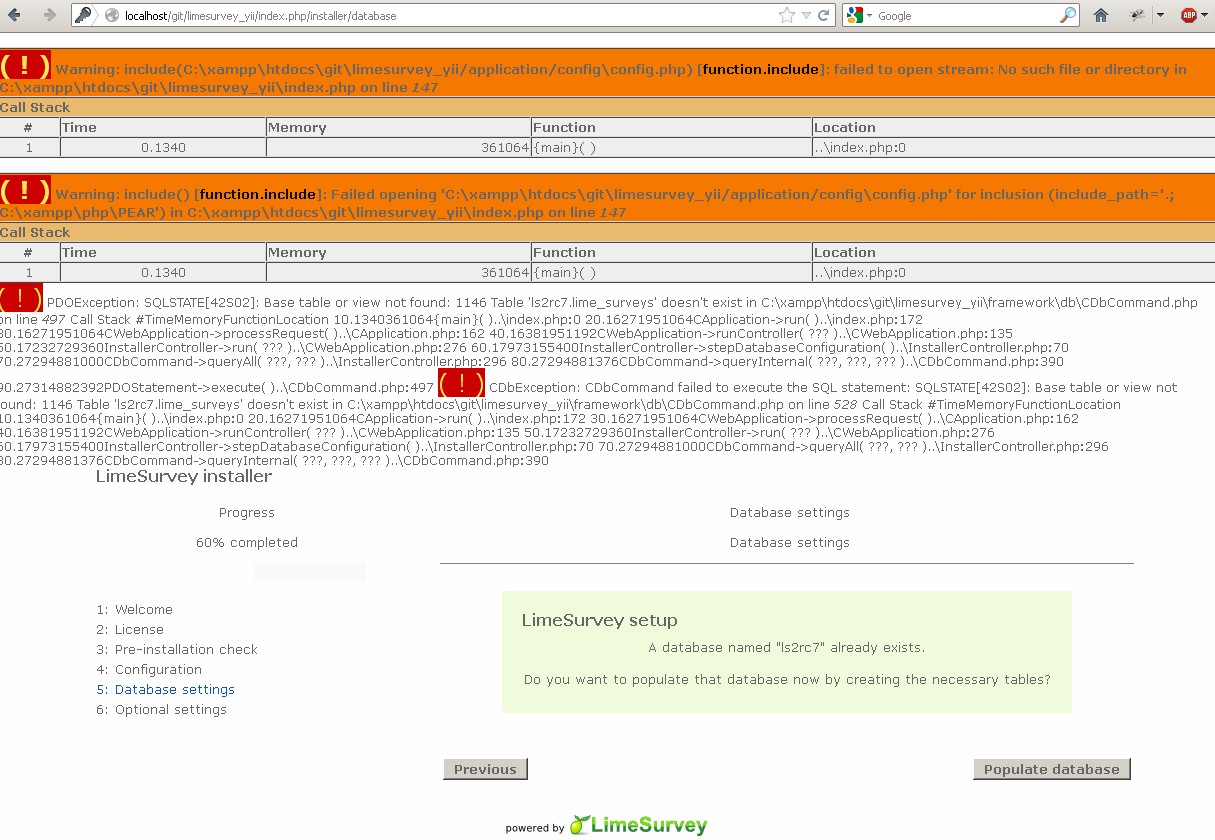 | Additional Information | PDOException: SQLSTATE[42S02]: Base table or view not found: 1146 Table 'ls2.lime_surveys' doesn't exist in C:\xampp\htdocs\ls2\framework\db\CDbCommand.php on line 497 Call Stack #TimeMemoryFunctionLocation 10.0012355224{main}( )..\index.php:0 20.02942021360CApplication->run( )..\index.php:171 30.02942021360CWebApplication->processRequest( )..\CApplication.php:162 40.03052021488CWebApplication->runController( )..\CWebApplication.php:135 50.04052790456InstallerController->run( )..\CWebApplication.php:276 60.05494926912InstallerController->stepDatabaseConfiguration( )..\InstallerController.php:70 70.13856653144CDbCommand->queryAll( )..\InstallerController.php:296 80.13856653520CDbCommand->queryInternal( )..\CDbCommand.php:390 90.13876655128PDOStatement->execute( )..\CDbCommand.php:497 ( ! ) CDbException: CDbCommand failed to execute the SQL statement: SQLSTATE[42S02]: Base table or view not found: 1146 Table 'ls2.lime_surveys' doesn't exist. The SQL statement executed was: SELECT * FROM | ||||
