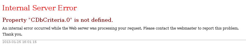 | Description | When i try to save a new configuration in "Generals parameters" of "Group of questions", i get an error "Property "CDbCriteria.0" is not defined." . Details of this error are in the screenshot. | ||||