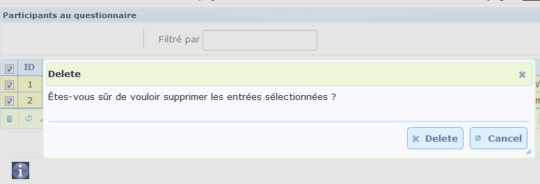 This 2 sentence seems not in https://translate.limesurvey.org/projects/limesurvey2/fr/default?filters[term]=Delete&filters[user_login]=&filters[status]=current_or_waiting_or_fuzzy_or_untranslated&filter=Filter&sort[by]=priority&sort[how]=desc Then bug, not translation :) |