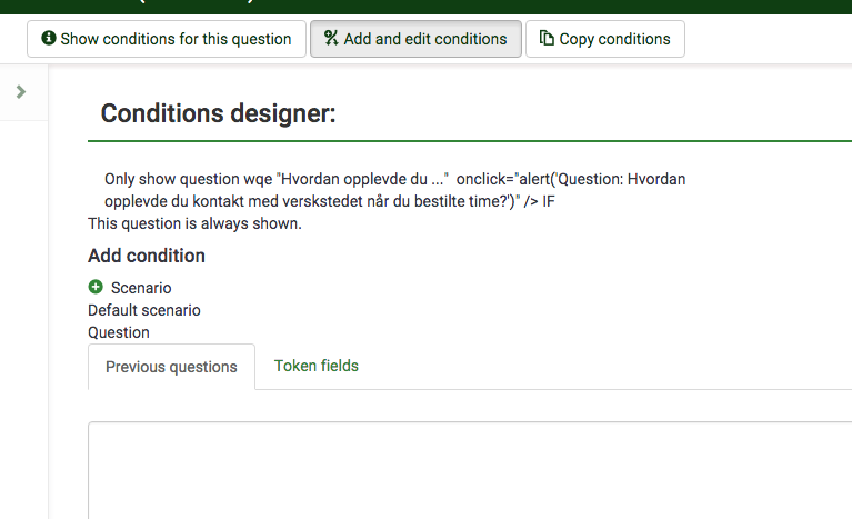 Still broken in 160213. The onclick stuff is still there. Same problem in all three sub menues in Conditions: Show conditions for this question, Add and edit conditions, Copy contitions |