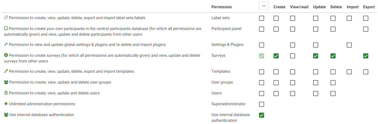 | Steps To Reproduce | Create a test user with restricted permissions (like in the attached screen) and log with it. You can see other people surveys (whereas you should not). Moreover you can see many many buttons to features that you can not use :