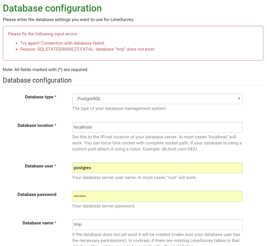 @olle : can you validate if LS is able to create table https://raw.githubusercontent.com/LimeSurvey/LimeSurvey/3ff4864c0c5d32016fb1f7f8bead380856a66571/application/controllers/InstallerController.php (previous file) with pgsql ? Seems return 7 : OK I just try with a user who have all rights on my system : with old system retunr "invalid connexion" |