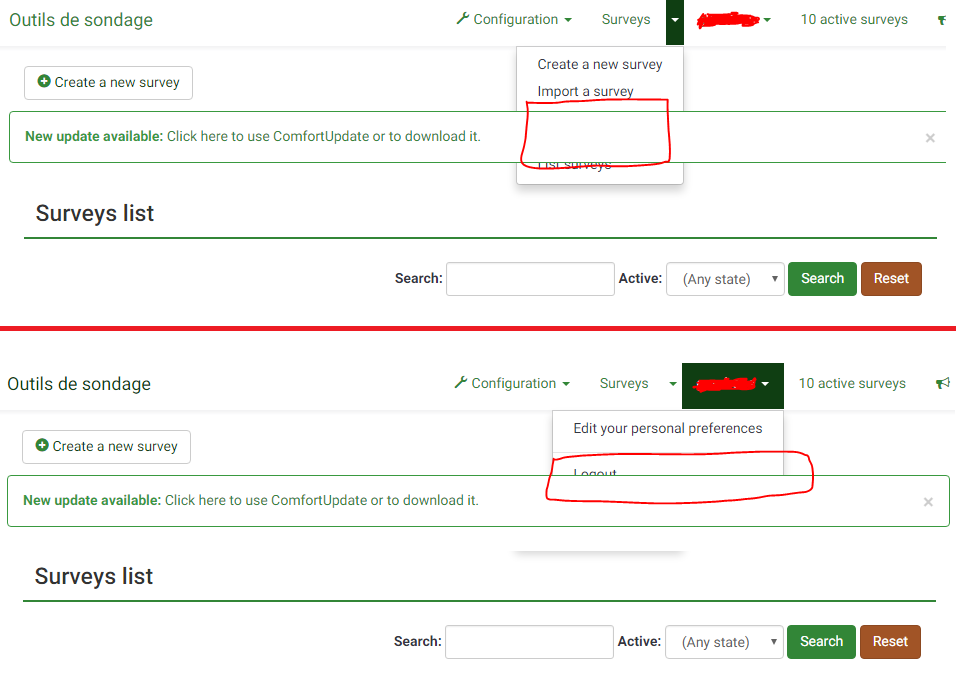 | Description | Version 2.50+ Build 160204 When an updated is detected by LimeSurvey, a message (e.g. : "New update available: Click here to use ComfortUpdate or to download it.") appears at top of screen. This message hides two menus : "Surveys" and "<<login>>" menus. Probably a z-index problem. I don't know if this problem appears on last Version 2.50+ Build 160213, because it must exist an update to show the message : no available update with lastest version... Thus, I tested on Version 2.50+ Build 160204. | ||||