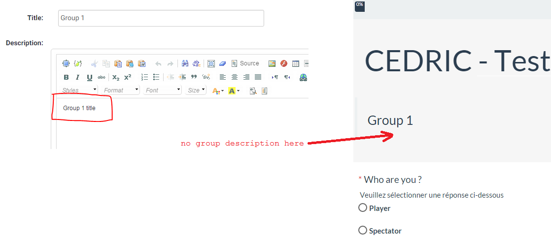 | Description | Go to : Survey properties > General settings & texts If this parameter has "Show both" value or "Show group description only" value, group description is hidden, regardless template ("default", "news_paper", "ubuntu_orange"). See .lsa and screenshot in attached files. | ||||