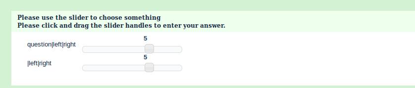 | Description | When using a multiple numeric input question with a left/right separator (e.g. |), the labels are not shown correctly on the left/right side of the question. Instead there is one label above the slider that contains the whole text (including the |). | ||||
