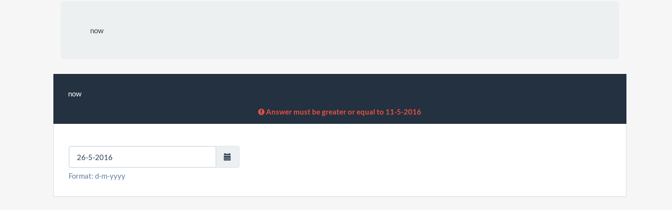 | Description | When using "Now" as min date - the actual date is excluded from the answer options (results in an error) - although the message states "greater or equal to 17/02/2016" Same with "Tomorrow" used as an end date | ||||