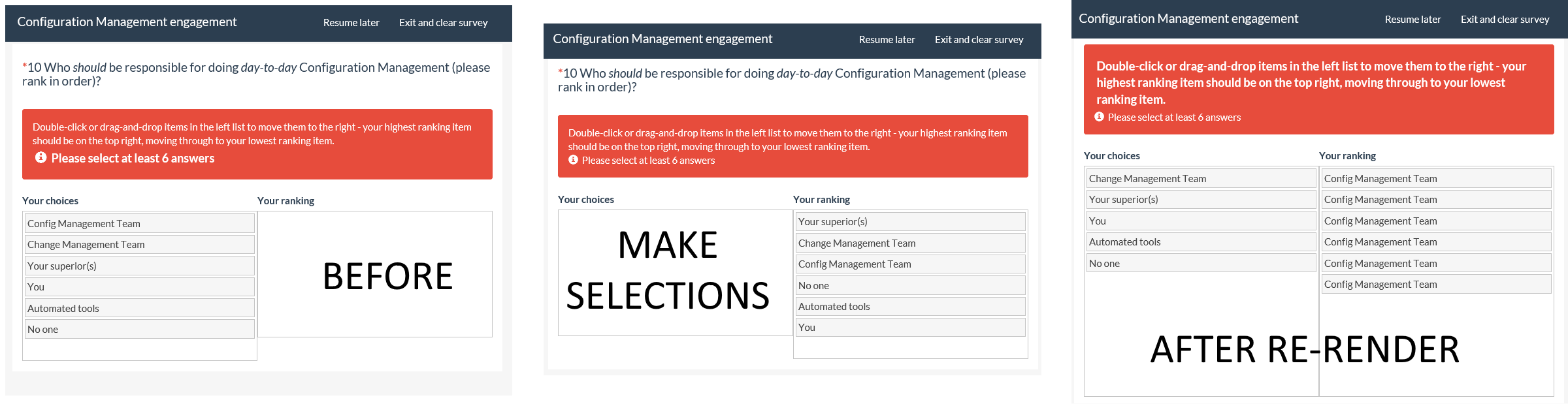 | Description | If you re-render a page AFTER completing a Ranking question, the answer is corrupted. The re-render might happen if you don't complete something correctly on the page (and you get the warning message) or if you go to another page and come back again. Every answer in the right box becomes the first item in the list. The remaining items in the list move back to the left box. See the attached screenshots. I get the same behaviour in Edge / Chrome and whether the question is mandatory and whether the minimum number of answers is set or not. | ||||