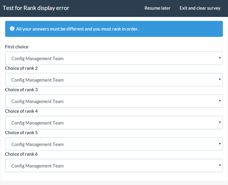 | Steps To Reproduce | Create a ranking question with several answers. Test the survey (you can't do it from preview as you don't have a next button). Have another mandatory question in the group so you can force the re-render by getting an error message on submit, or have more than one page to go previous / next. Complete the ranking list. | ||||
