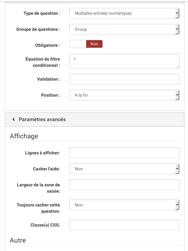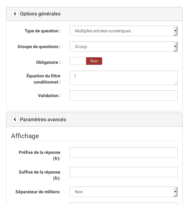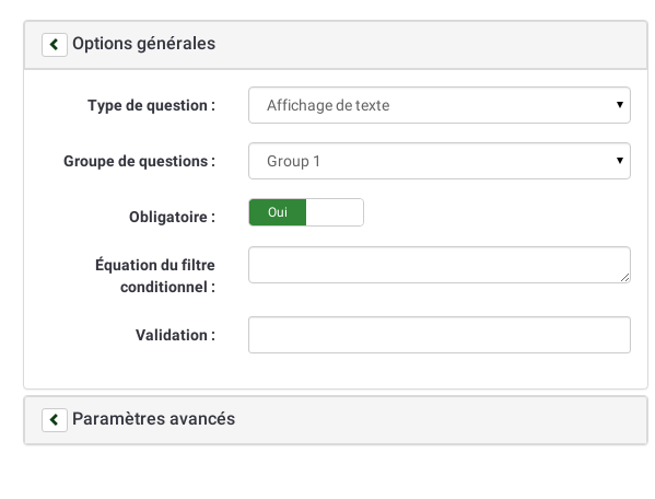Denis, je te propose de parler en français car c'est un bug assez important, et je n'arrive vraiment pas à le reproduire : Ce que tu me dis, c'est que sur un questionnaire, quand on change le type de question, les options avancées ne sont pas mises à jour ? |