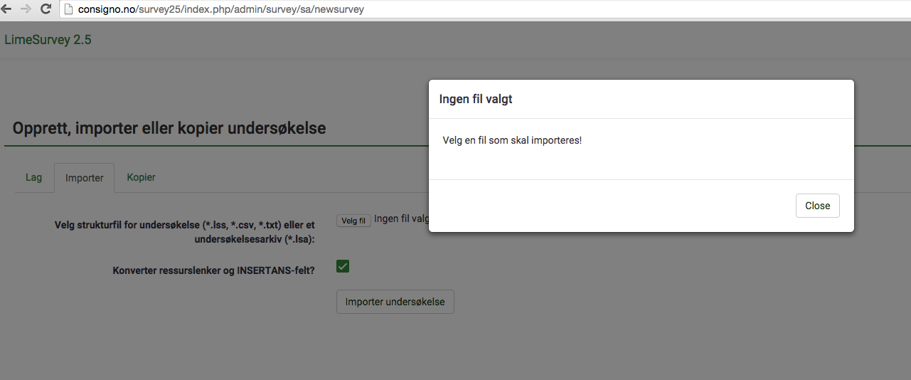 | Description | I make a new survey and then import one. Click Import without selecting a file first shows this error message with the Close button untranslated. See screenshot. | ||||
