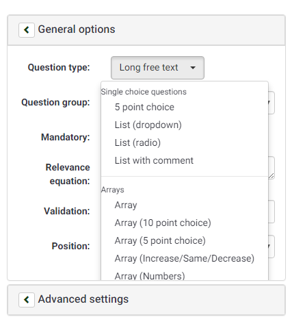 | Description | The "Question Type" dropdown is broken in this version. It does not show the full extent of the field options, it is cut off by the bottom of the pane. It cannot be scrolled, therefore most of the options are not visible. | ||||