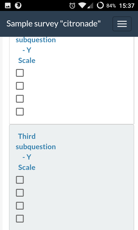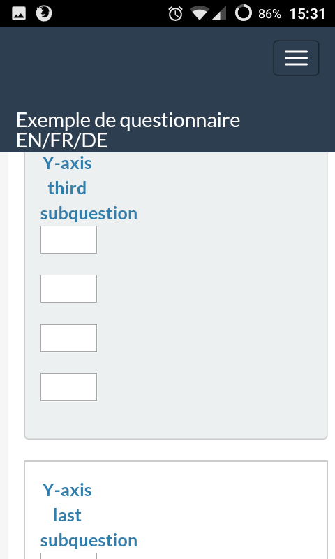 I'm going to have a deep look into it right now. But first : it's using no-more-table pattern, the only, and not perfect, way to have responsive tables. Responsiveness of tables is one of the most debated and studied subject of those last years. The conclusion is that there is no perfect solution. Tables display logic is not compatible with responsiveness. Tables should be absolutely avoid in modern design. Again : People creating surveys should accept in the future to totally avoid to use arrays. Arrays were perfect for printed survey, they are not convenient at all for screens (for display reasons, and for data reasons) So people who want responsive surveys should just not use arrays at all. We should make it clear : "If you use array : it implies your users will pass the survey in big screens, not in small ones. If you want your survey to work on small screens, don't use arrays question types." Any array question can be explode in different questions. |