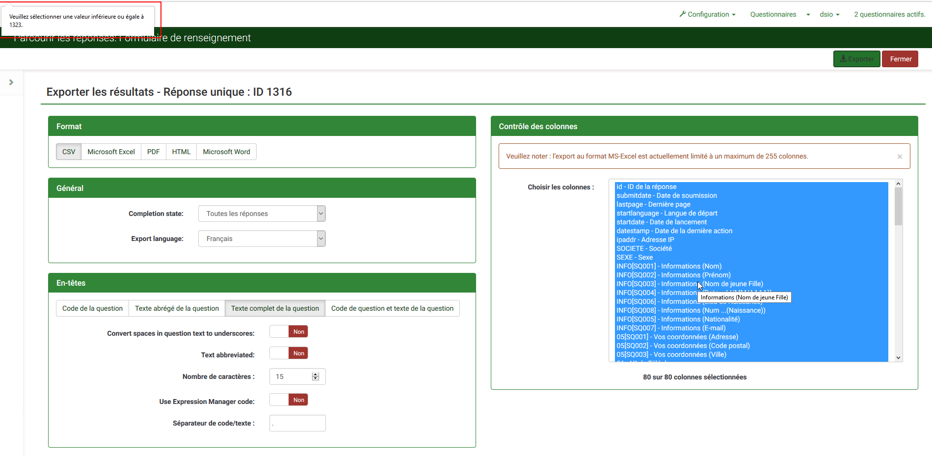 | Description | Version 2.50+ Build 160228 / PHP 5.5.32 Hi, Since my last update i can't export a single response (csv or excel or pdf etc...) i have a pop up (see capture). But i use an other path, like export from all answer, and specifiy the Range/id of the answer (1316), it's work. it's like if he need the range from a single export. | ||||