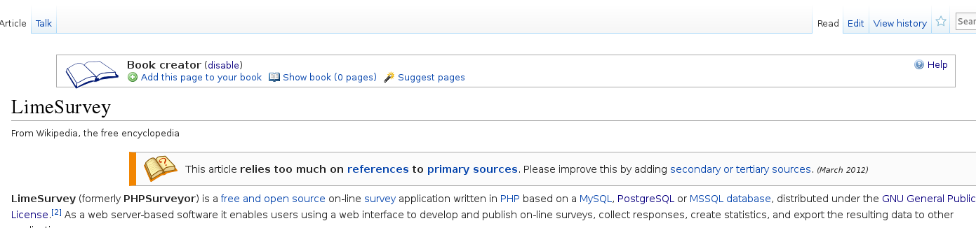 | Description | A lot of user want a PDF or a book of the manual. Actually wikipedia use Books : https://en.wikipedia.org/w/index.php?title=Special:Book&bookcmd=book_creator&referer=LimeSurvey It work : i send a pdf generated. But seems broken with some advanced feature. | ||||