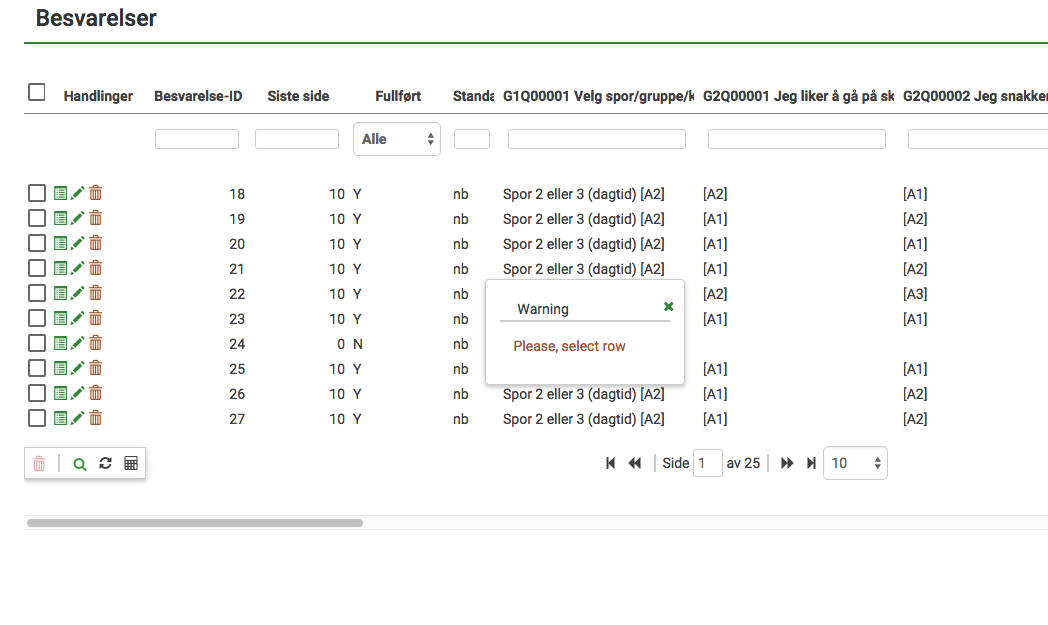 | Description | When browsing answers I choose to delete a row (the bin icon below the list of answers WITHOUT selecting a row first. A warning popup is displayed. The text is not translated. See screenshot. | ||||