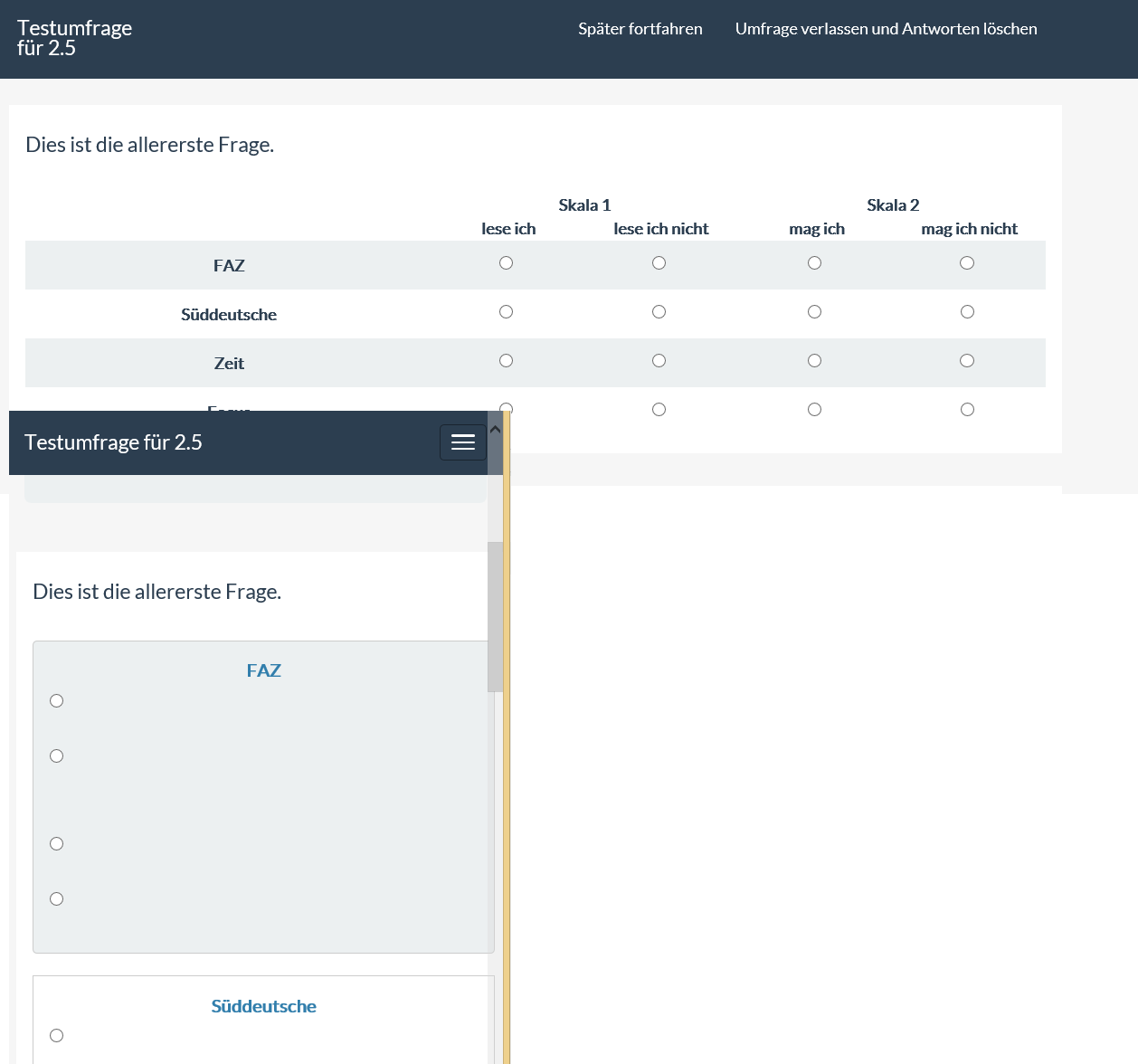 | Description | Hi guys, if I scale down the screen / reduce width of the browser the matrix questions wraps not correctly. Answer options are no longer displayed. | ||||