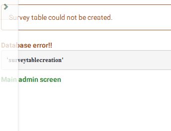 | Description | Trying to activate the survey, the homepage tells me: Survey table could not be created Database error! | ||||