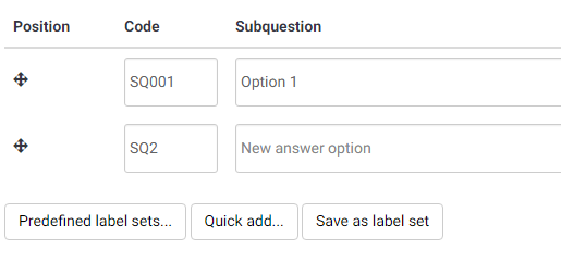 | Description | 1) The default sub-question code is SQ001 but when adding more sub-questions the default codes are SQ2, SQ3... These should default to sequential codes like in 2.06. 2) The placeholder text in new sub-questions is "New answer option" but should be "New subquestion". 3) In my opinion, the placeholder text should be a lighter color than the input text. 4) In my opinion, the placeholder text should disappear as soon as the input is focused, not when typed in. | ||||
