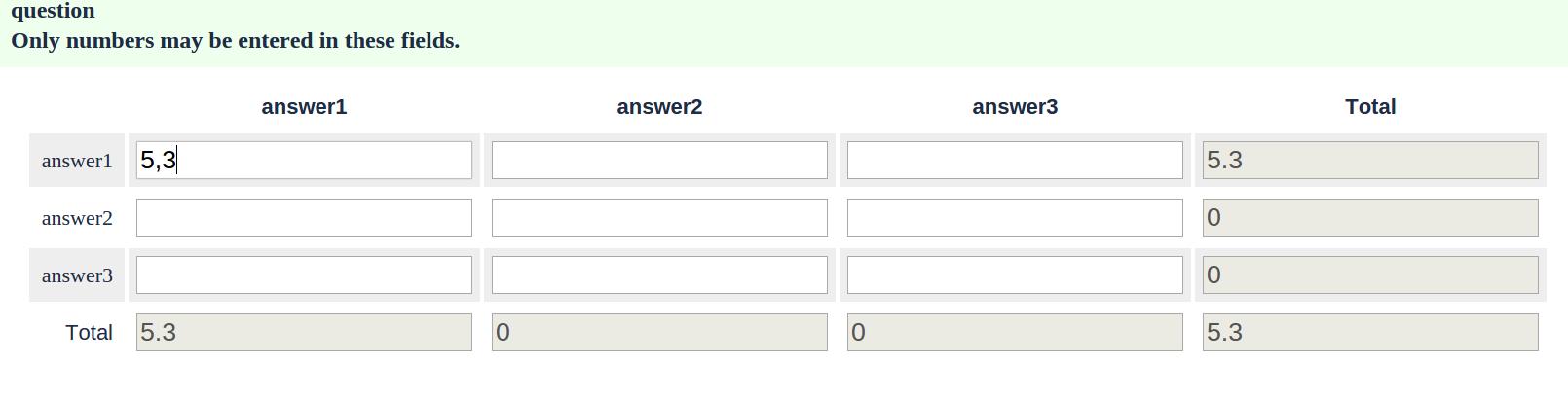 | Description | When using comma as thousand separator in a survey, and "Show totals" in a Array(Texts) question, the input box will use the comma, but not the toal (see picture attached) | ||||