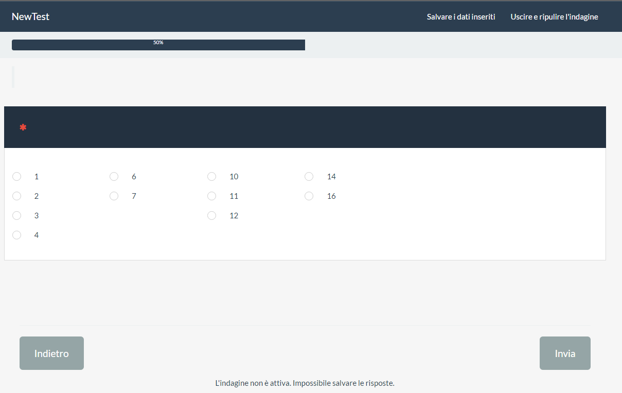 | Steps To Reproduce | #1 create a survey -- OR -- #1 import the atached survey and select 1-2-3-4-6-7-10-11-12-14-16[example] | ||||