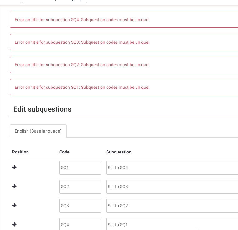 | Additional Information | We can use move an update the sentence, but it happen sometimes in real situation where : sentence have a big HTML opr are in another language The only solution is It's a tricky issue : each subquestion validation happen, but when try to udate SQ1 to SQ4 : SQ4 still exist. | ||||