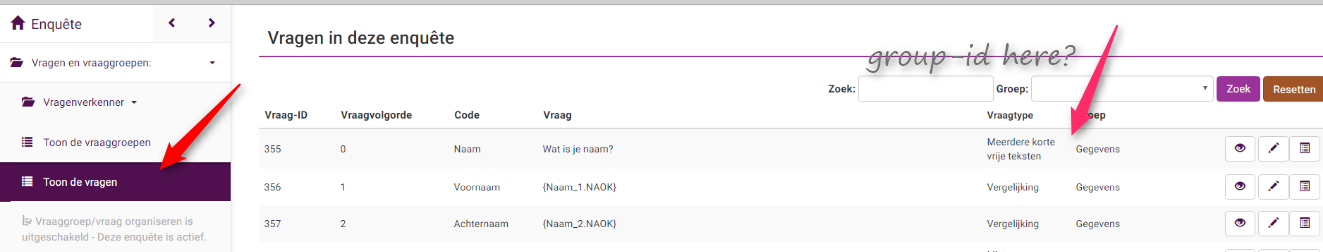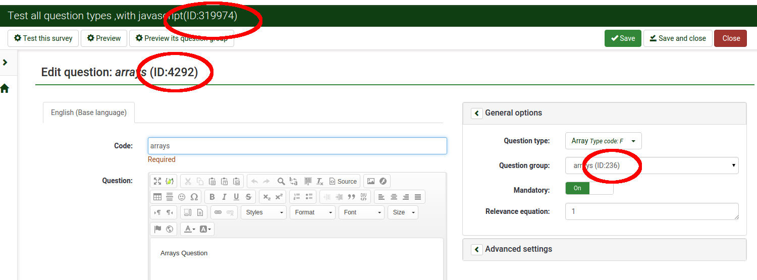 | Description | In previous versions the sid,gid,qid of a question was almost always visible, see attached sidgidqid_old.png. In the new interface of 2.5 you have to navigate to [Question and groups, List questions] to find the question-id (qid). The Group-id (gid) is not visible there. This gid can be found in [List question groups]. So if you are editing a question, and want to know the gid and qid, you have to navigate to two different lists to find them. And then return to your question. This leads to a lot of clicking and scrolling. I would like the gid and qid to be visible again in [Question summary] and [Edit-question]. And other option is to add the gid in the [List questions-view]. You can argue if this is a bug or a feature request. As the id's were visible in the previous versions, I call it a loss of functionality, so a bug ;). Regards, | ||||