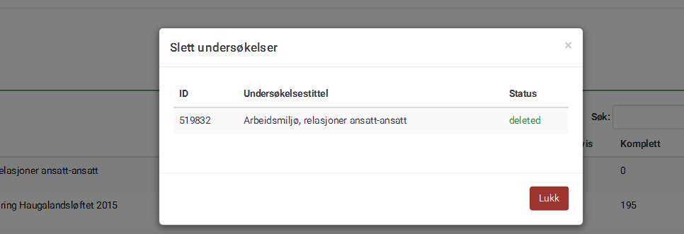 | Description | The status "delete" and possible others are not picked from language files. This happens if I delete a survey from the survey list with the new select a survey and then delete from the drop down menu. The status message in the popup is not translated, see screenshot. | ||||