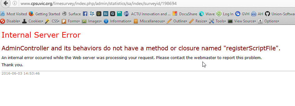 | Steps To Reproduce | Visit a live survey. Click on "Responses", then "Responses/Statistics". Choose the Statistics option in the menu. Script crashes with following message: Internal Server Error An internal error occurred while the Web server was processing your request. Please contact the webmaster to report this problem. Thank you. | ||||