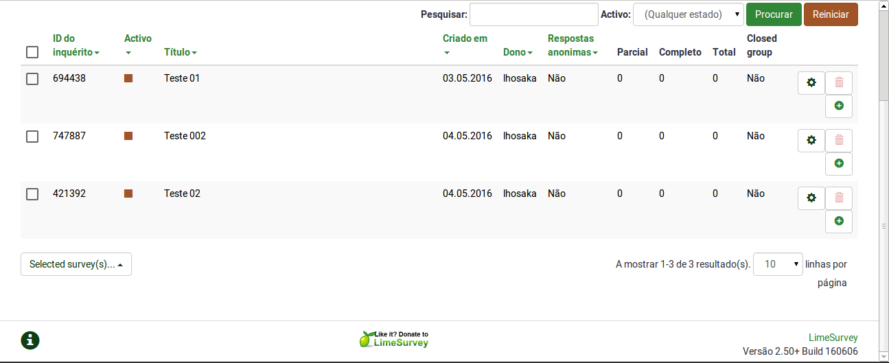 OK, Now limesurvey is presenting the list of questionnaires correctly. Sorry if I could not explain the problem properly. Thank you for your patience and for the resolution of the problem. |