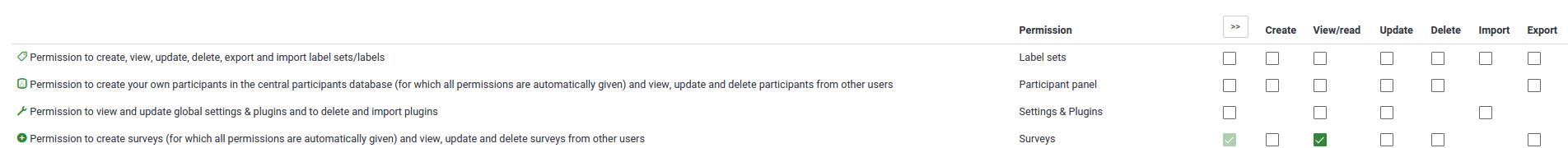 well, in the screenshot you just attached I see no permission for that user to read other users's surveys. So that's normal that he can't see them. Again, 160525 wasn't respecting the permissions. |
