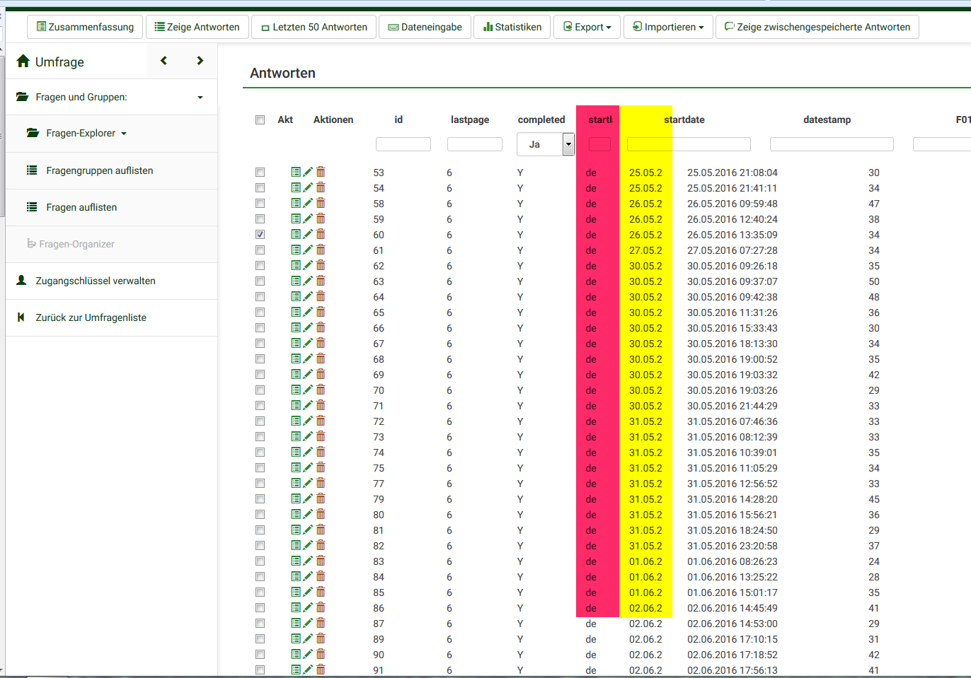 | Additional Information | I added a screenheot where the colum startlanguage id cut of within the title and teh startdate is cut off within its content (colored yellow and pink). Maye all iof the meta data not belonging to a single question) shell be left alingned (title and content)? | ||||