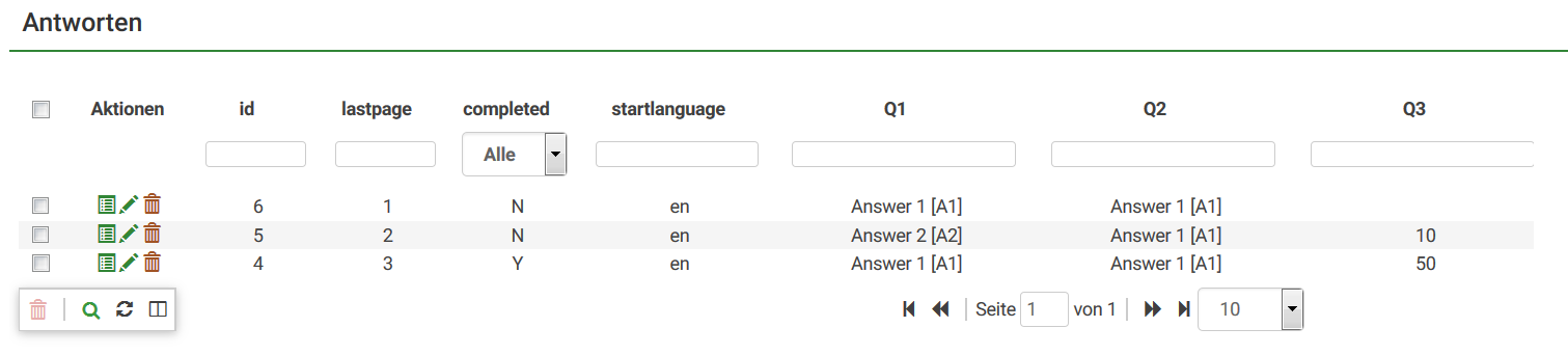 I am sorry, my initial description ("not shown") was not concise. See added screenshot of answers: id=6: Survey was started, Q1 was answered, button "Next" was clicked, then survey window (browser window) was closed. But there is an answer (the default value) saved for Q2. id=5: Survey was started, Q1 was answered, button "Next" was clicked, Q2 was answered, button "Next" was clicked, then survey window was closed. But there is an answer saved for Q3. My opinion: Default-answers must only be saved when "Next"-button is clicked, as there must be an "active approval" of the default-values. |
