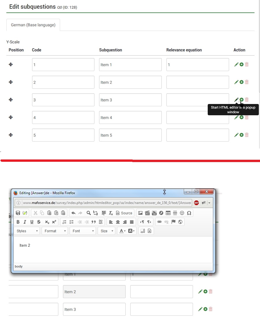 | Description | I try to edit an entry in part "Y-Scale" of "Edit subquestions". I try to edit an entry in part "X-Scale" of "Edit subquestions". | ||||