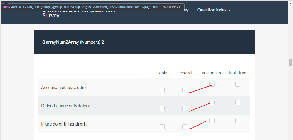 | Description | Using the latest LS version and default template I get the misalignment shown at the uploaded screenshot for the array numbers (checkbox layout) question type. This may affect certain resolutions only (~ >800 and < 1000px). | ||||