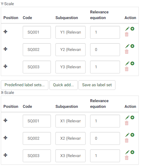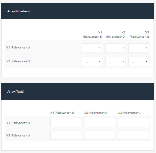 | Description | Array (Numbers and Text). X-axis subquestions cannot be hidden by relevance equation. Y-axis works fine. | ||||