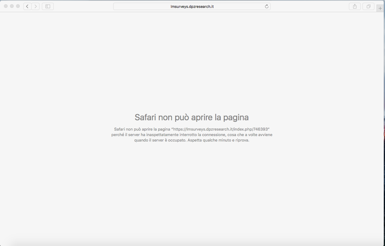 | Description | For a while my surveys run pretty well, the last one I run was a closed survey to collect some general data from users, but my team receives a lot of mail from safari users on mac, they can't complete the interview !! Sometimes after the first question, sometimes after the second or the last, but the problem is huge, it just display a server error (only safari on mac)! | ||||