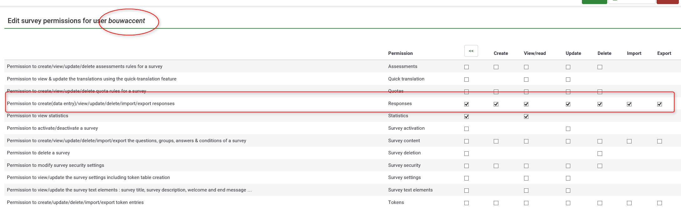 | Description | The user-permission 'Permission to create(data entry)/view/update/delete/import/export responses' seems not to be working correctly. As a check I also set the permissions 'Permission to view statistics'. | ||||